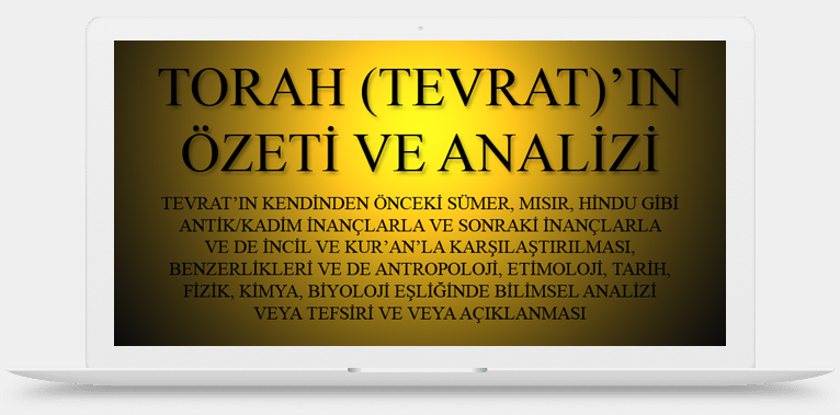 Bu kitapta Tevrat, İncil ve Kur’an baştan sona ele alınmış, en önemli maddeleri seçilmiş ve bunların diğer tüm inançlarla -karşılaştırmalı dinler tarihi veya birbirleriyle benzerlikleri bazında- teolojik analizi ile bilimsel analizi yapılmıştır. Bu kitap sitedeki 26, 27 ve 28. bölümlerin birleşimidir: Kitap tamamlanmıştır: 37 konu vardır: (A5, 11 pt) ∼350 sayfadır.